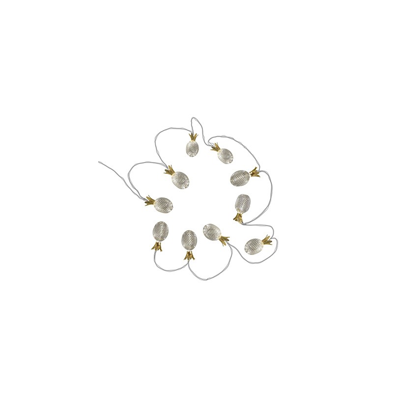 Serie de luces led en forma de piña dorado fabricada por Asly Lighting. Ideal para el hogar, ya que brinda una luz cálida y agradable. El paquete incluye 20 luces led con hilo plateado. Sus dimensiones son de 482 cm de ancho x 6.5 cm de largo x 6.5 cm de alto 3.3 cm de profundidad x .16 g de peso. La distancia entre las luces es de 20.32 cm. Elaborada de metal color plateado. Las luces tienen una capacidad de 0.4 watts cada una y dan un total 120 volts de potencia.