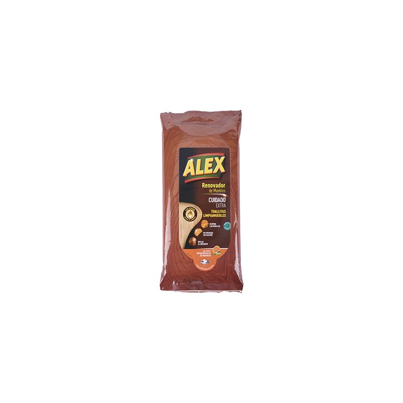 Toallas Limpiamuebles Alex en aroma de notas frutales de naranja, tienen la función de limpiar superficies para eliminar huellas, polvo o manchas fácilmente. Contiene serum natural de madera que proporciona brillo al instante en los muebles, sin dejar grasa, rastros o residuos de la fórmula. Su aroma frutal permite mantener la sensación de frescura por más tiempo; el paquete incluye 24 piezas en bolsa resellable que mantiene la humedad de cada una de las toallas.