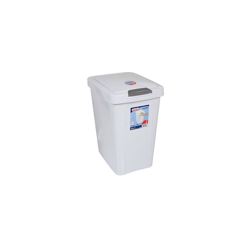 Bote touch top para basura Sterlite, con capacidad de 30 litros. Cuenta con una tapa que se abre al tacto. Su uso es adecuado en interiores. Hecho de plástico blanco con acabado brillante resistente a la corrosión. Sus dimensiones son 43.5 x 34.5 x 26 cm y su peso de 1.075 kg.