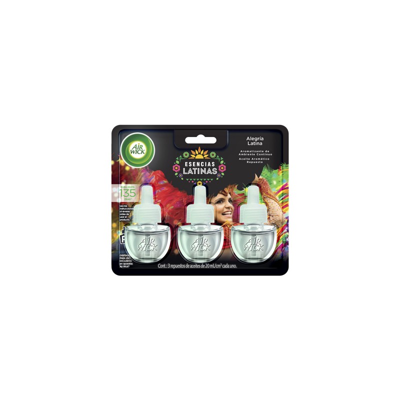 Repuestos de Aromatizante Eléctrico Airwick con aroma con aroma Alegría latina. No incluye aparato 3 piezas de 21 mililítros cada uno.