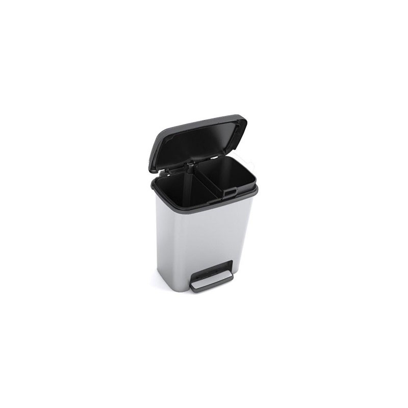 Basurero de pedal para reciclaje con dos contenedores de 20 litros cada uno, en acabado acero inoxidable. Combina un diseño simple y elegante, es compatible con su selección de tamaños para todo tipo de espacios. Fácil de limpiar y utilizar, muy buena estabilidad, de dimensiones reducidas y con gomas antideslizante. Equipado con anillo para sostener y ocultar las bolsas de basuera. Fabricado en plástico polipropileno que le brinda resistencia y durabilidad permitiendole contener líquidos sin fugas.