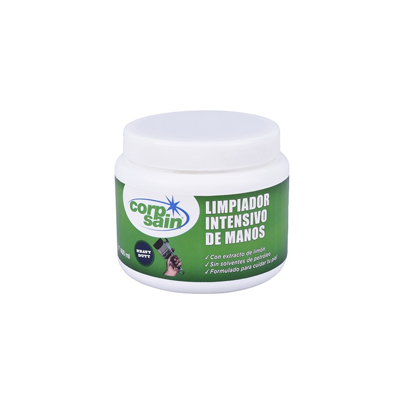 Limpiador Intensivo de Manos 400 mililitros Corp Sain, elimina con mayor facilidad los restos de grasa o pinturas al terminar de trabajar. Está formulado con extracto de limón ingrediente que además de cuidar la piel de tus manos es un excelente desengrasante y desinfectante natural. No contiene solventes de petróleo, su consistencia es suave contigo pero implacable con las manchas. Cuenta con exfoliantes no agresivos que ayudan a realizar una limpieza más rápida que cuida la piel.