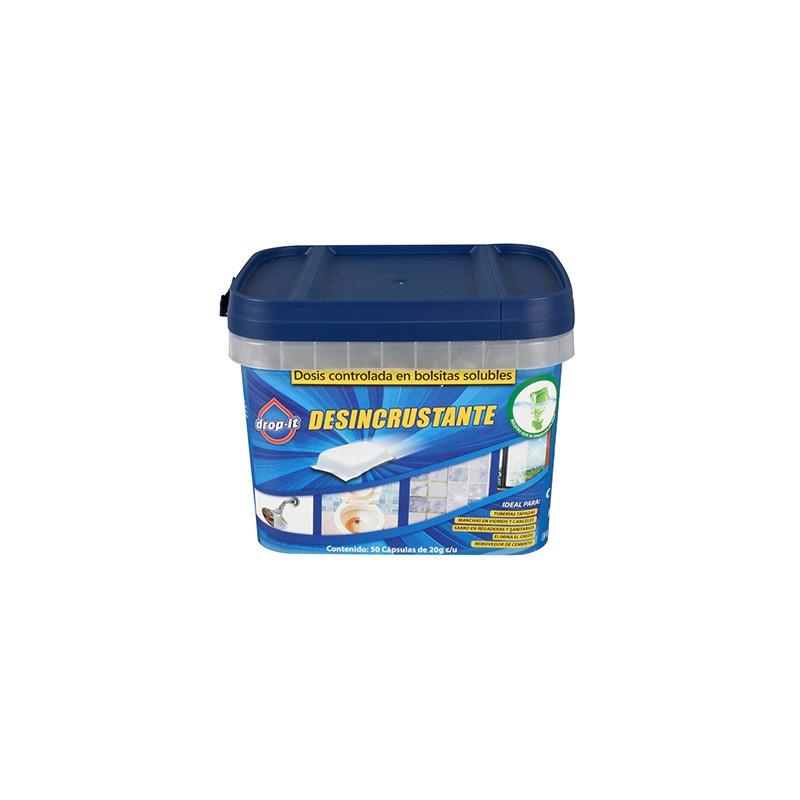 Desincrustante diseñado para usarse en tuberías tapadas ayuda a eliminar manchas en vidrios y canceles, quita el sarro en regaderas y sanitarios, elimina el óxido y es auxiliar en remover cemento. Polvo encapsulado en una bolsita soluble que proporciona un método innovador de limpieza. Por su presentación compacta y ligera reduce el espacio de almacenamiento. Producto de uso práctico, rendidor y biodegradable. Incluye 50 cápsulas de 20 gr cada una.