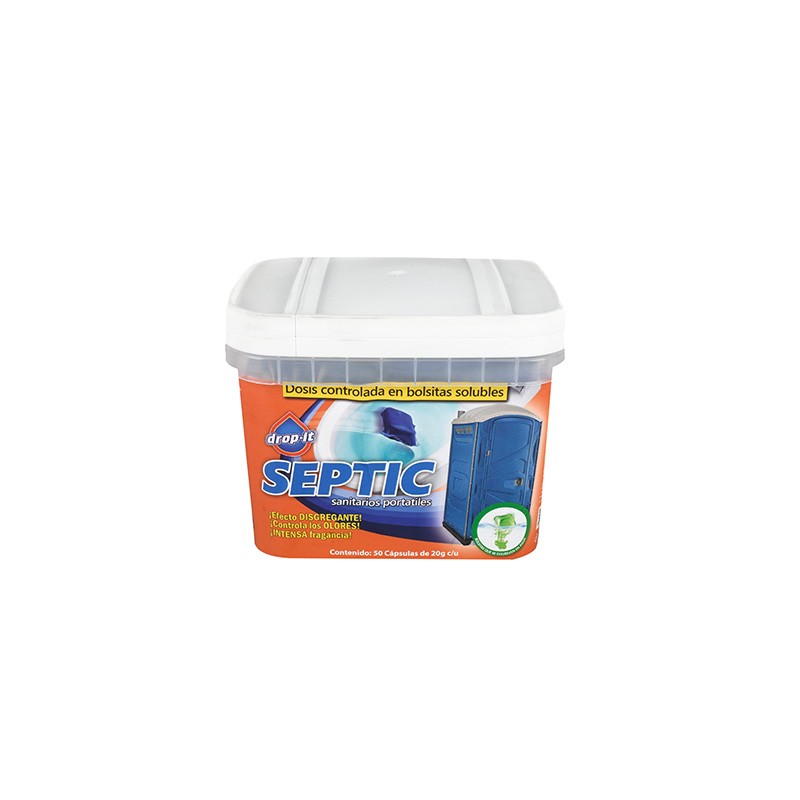 Septic para sanitarios portátiles en polvo con 50 cápsulas con 20 gr cada una, otorga un efecto disgregante. Está elaborado químicamente con efecto disgregante, deodorizante y desinfectante que mantiene los sanitarios móviles de aviones, autobuses, barcos y campers con una agradable fragancia de rápida dispersión que garantiza a largo plazo el control de olores en condiciones normales y extremas. Brinda a las aguas de los sanitarios un color azul intenso que no se decolora, no mancha y es amigable con el medio ambiente.