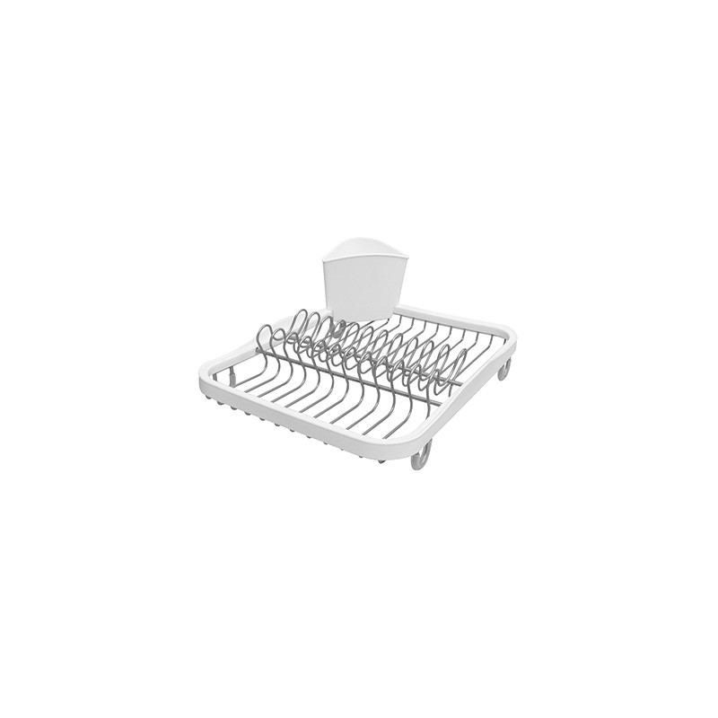 Escurridor rectangular tipo skin Loft, gris con acabado semi brillante, con cupo para 13 platos. Incluye un depósito removible para cubiertos y una goma anti derrapante. Sus dimensiones son 36.6 x 27.9 x 14.4 cm y pesa .822 kg. Fabricado de metal resistente a la corrosión, brindándole mayor durabilidad.