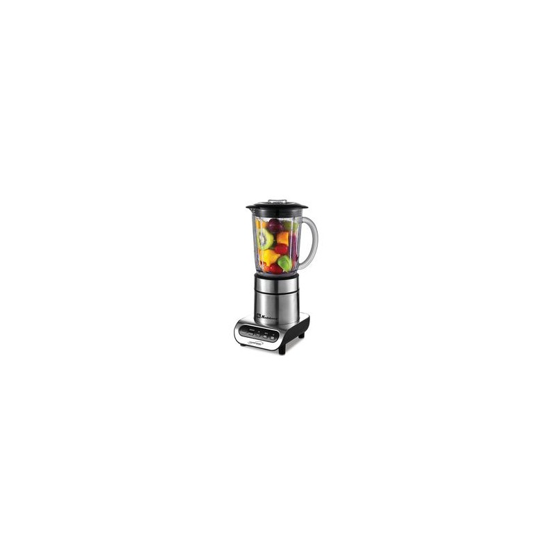 Licuadora Profesional de Acero Inoxidable. Control electrónico multifunciones: con funciones de licuado, smoothie + pulso. Vaso de cristal de borosilacato de 1.5 L de alta resistencia. Cuchillas bidireccionales y ultra-reversibles de acero inoxidable en 2 niveles y de fácil limpieza. Sistema de bajas revoluciones para retener los nutrientes y fibras naturales. Motor de 1,000 Watts. Licuado de alta eficiencia para vegetales y frutas sin adicionar agua. Muele grano de café, nueces, pimienta. Tapa de vaso medidora.