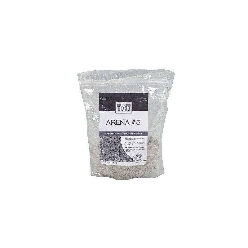 Arena #5 para construcción; fabricada especialmente para mezclarse con cemento y poder hacer pequeñas reparaciones, ya que funciona como excelente relleno para grietas. Idónea para densificar pinturas, puede utilizarse para crear morteros, unir bloques o parchar superficies. Por su mezcla compuesta, al hacer contacto con el agua permite una fácil reparación y aplicación para cualquier zona de cemento y muros de mampostería, tanto residencial como comercial. Ofrece un secado de 24 horas.