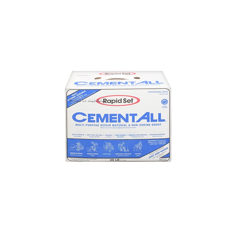 Material multiuso para reparaciones de concreto Cement all blanco 11.3 kg Rapid Set, útil para reparar anclajes de concreto, contrapisos, lechada industrial, castillos, entre otros. Es práctico al momento de su aplicación, sólo requiere agua; se pueden obtener acabados lisos, flotado o de escoba. Cuenta con tecnología anti cuarteamiento y es amigable con el medio ambiente, debido a que no emite tanto CO2 en comparación con otros productos. Logra una resistencia estructural en 1 hora.