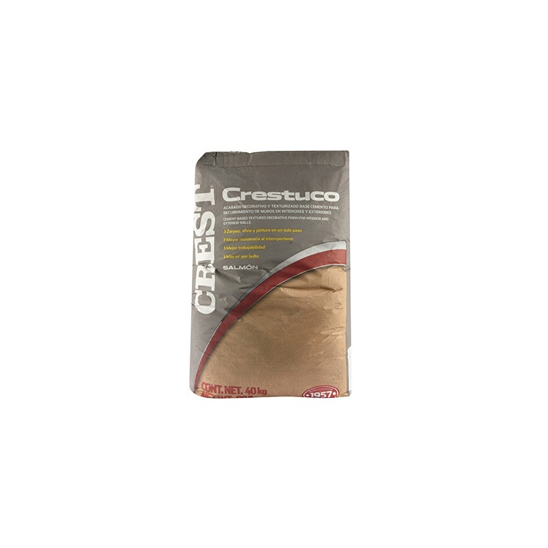 Recubrimiento Crestuco color salmón 40 kg Crest, brinda un acabado decorativo y texturizado por ser un recubrimiento base cemento con pigmentos especiales, refuerzos poliorientados y agregados pétreos de granulometría controlada. Su uso ayuda a sustituir zarpeo, afine y pintura en un sólo paso, provee una excelente repelencia al agua evitando la filtración de humedad por lluvia con tan solo 3 mm de espesor, es recomendado para el recubrimiento de muros en interiores y exteriores. Brinda un rendimiento de 6.0 m2 por bulto de 40 kg sobre block y 9.0 m2 sobre superficie afinada.