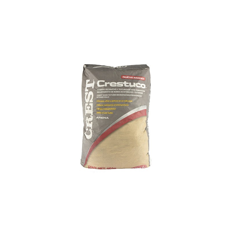 Crestuco color Arena de 40 kilogramos está fabricado especialmente para el recubrimiento de muros en interiores o exteriores, sobre superficies afinadas o planas. Por su mezcla de pigmentos especiales y al hacer reacción ante la hidratación, se convierte en una pasta que al aplicarla sustituye al zarpeo, fine y pintura. Ofrece una mayor resistencia al intemperismo, provee una excelente repelencia al agua, evitando la filtración de humedad por lluvia y permite una buena manipulación para obtener un acabado adaptado a tu gusto o creatividad, ya sea que lo desees afinado o texturizado.