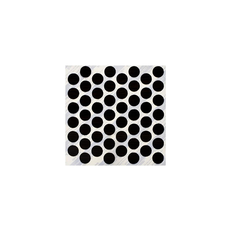 Tapa tornillo de melamina. Color wenge con pegamento (es decir preengomada). sirve para Tapar ranuras u orificios hechas por el taladro. esto es para darle una imagen al tablero de que esta completamente liso. se quita con cuidado de la plantilla y se coloca en el lugar indicado con los dedos. plantilla con 52 pzas. 14.3 mm de diámetro y 0. 46 mm de espesor. Peso: 8 gr.