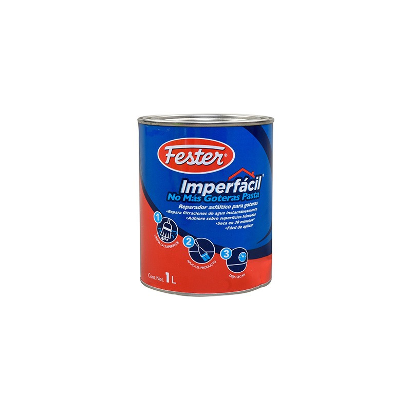 Reparador asfáltico para goteras Fester Imperfácil pasta negro de 1 litro, su aplicación ayuda a evitar la formación de goteras. Repara las filtraciones de forma instantánea al adherirse en 30 minutos en superficies húmedas o secas. Su consistencia pastosa está formulada a base de asfalto modificado, solventes especiales de rápida evaporación, rellenos minerales, fibras naturales libres de asbesto y aditivos especiales que le permiten tener excelentes propiedades de adherencia. Es apto para reparar fisuras, grietas, ranuras y juntas en superficies de concreto, lámina, asfalto y petrificados.