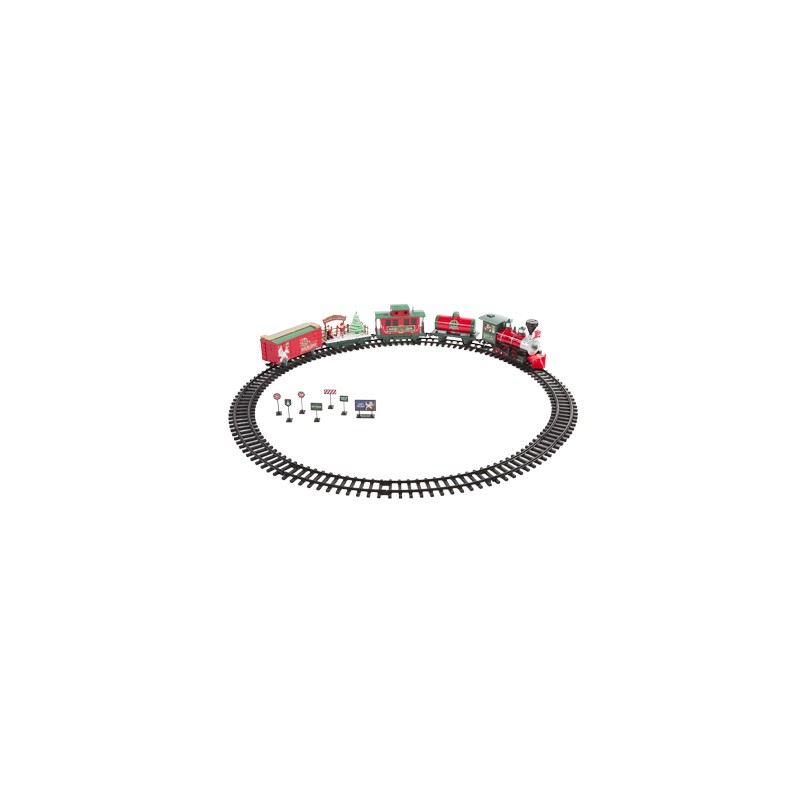 Deslumbra a tus invitados con el tren de juguete navideño Expreso Polar con 33 piezas, incluye la locomotora, 5 vagones, 7 señales de carretera, 12 vías de tren curvas y 8 rectas y un control remoto con el que se activa y se detiene. Enciende sus luces y reproduce canciones de navidad, además posee sonido de tren real.